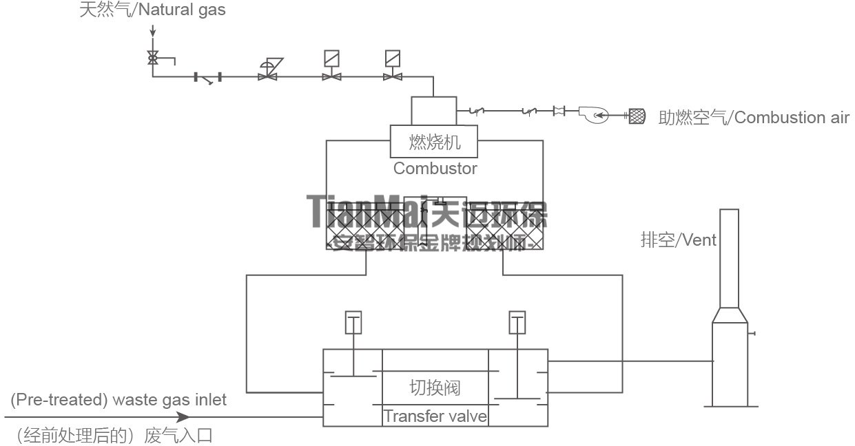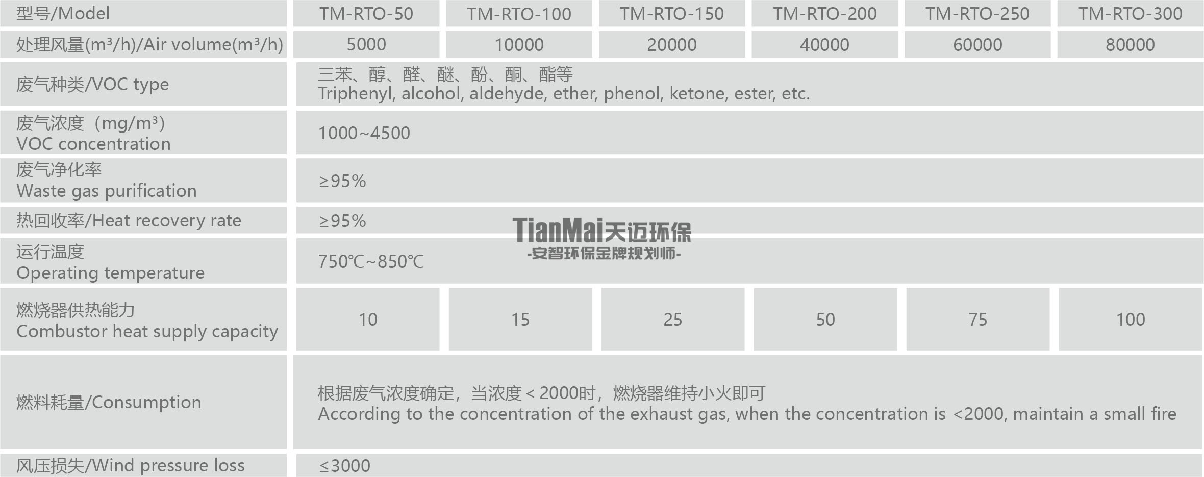蓄热式焚烧炉采用天然气直接燃烧有机废气,在750~850℃的温度下,将有机分子分解为CO2和H2O,燃烧后的烟气通过蓄热陶瓷砖将质量继续在陶瓷内,预热有机废气,然后再排放,废气的进出方向通过切换阀自动切换,循环工作,RTO可以充分回收燃烧机分解热能,使得系统能耗大大的降低。 蓄热式焚烧炉RTO系统,由废气前处理干燥,过滤器,切换风阀,燃烧炉,助燃系统,,压缩空气系统,排气系统组成。 规格参数