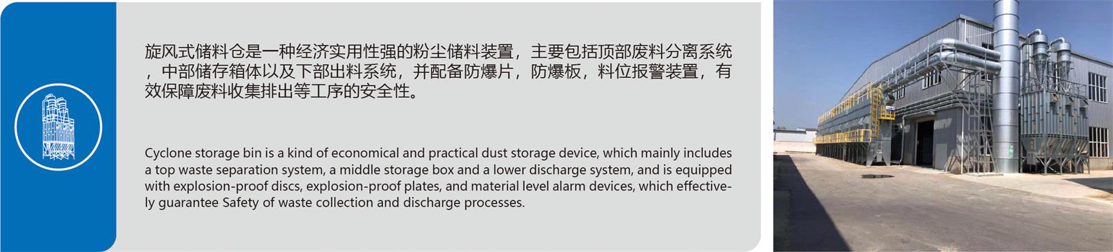 旋风式储料仓是一种高效率经济实用性强的粉尘储存装置,它有占地面积小、结构简单、维护管理方便、能耗少、运转平稳、故障率低、宽容度大、除尘效率高等优点。