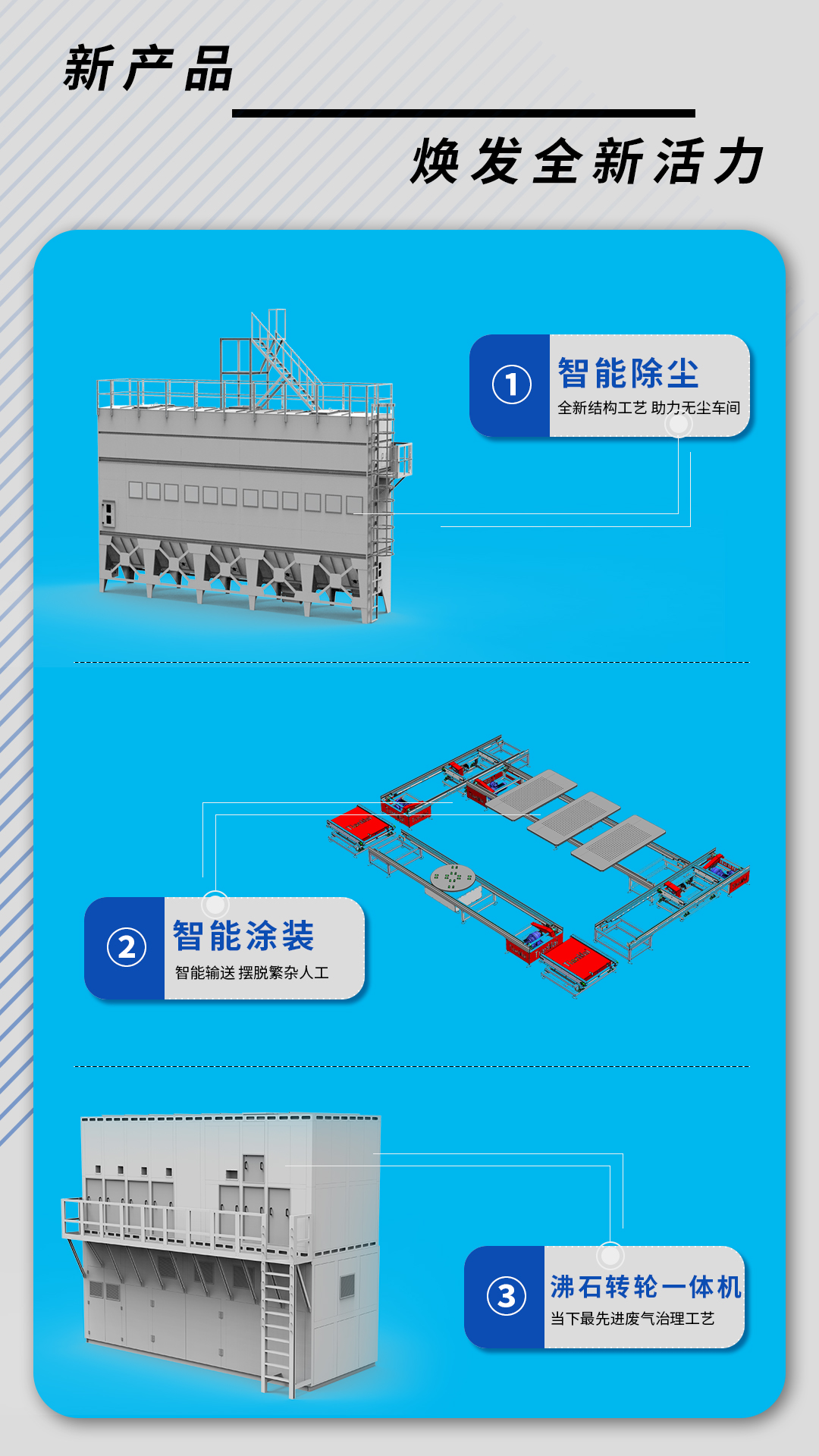 本次展会,天迈发布新工艺除尘系统、沸石系列废气治理与智能涂装领域全新解决方案,从工艺路线,结构原理,安全性能,智能控制等方面进行全面创新,为客户环保智能工厂提供了多样化更合适的选择,更加契合工厂使用需求,完美助力客户环保工厂。同时让客户始终能够应用行业前沿的环保技术,为客户工厂提供更坚实的技术支撑。